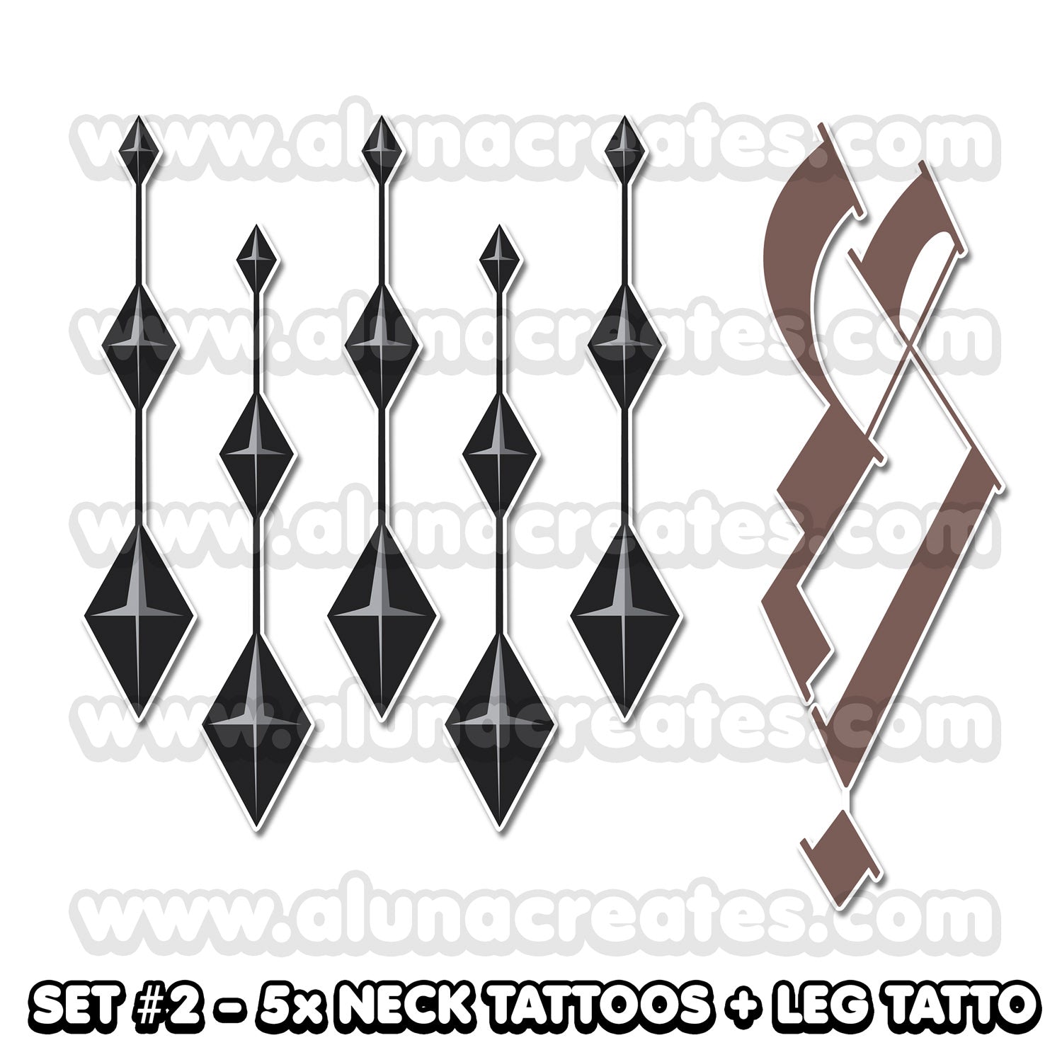 Wszystkie tatuaże są ilustrowane przez AlunaCreates. Nie rości sobie żadnych praw do oryginalnej postaci ani powiązanych treści.