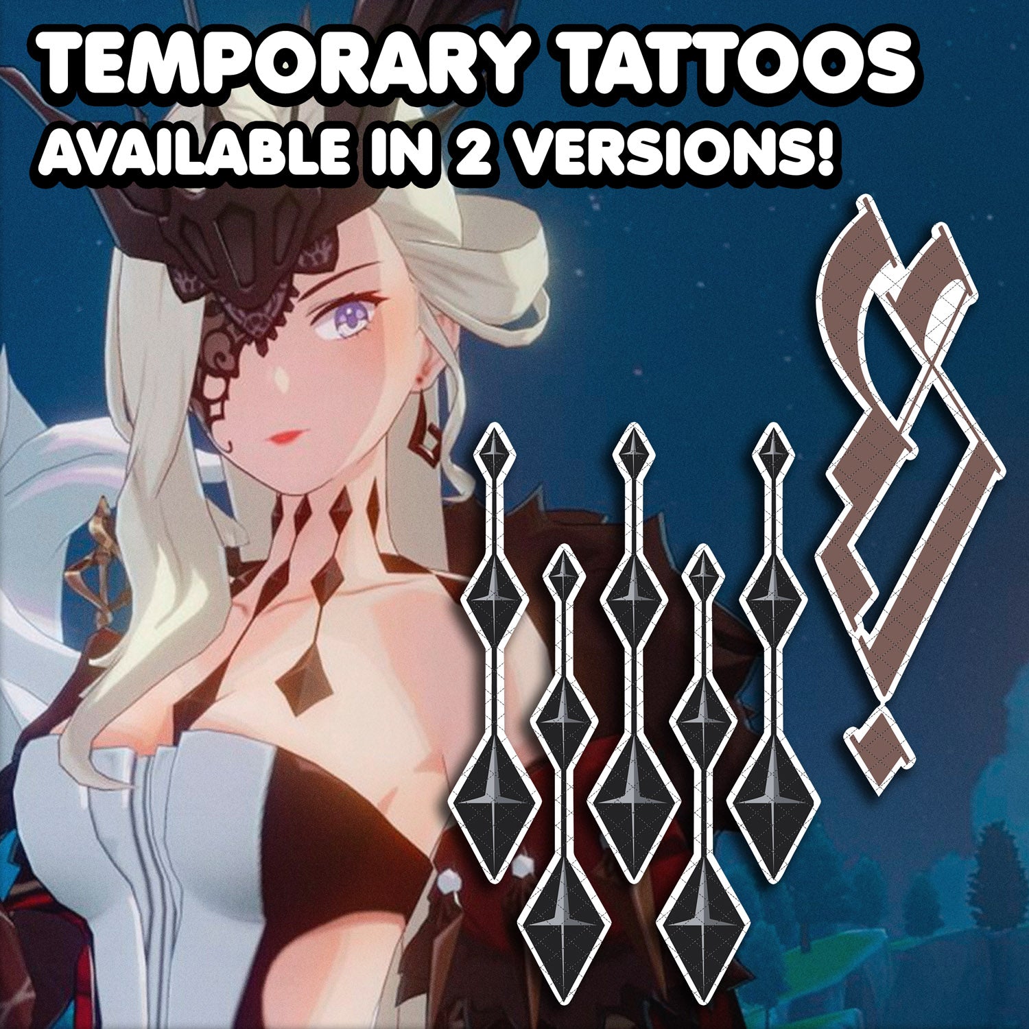 Temporary Tattoos inspired by La Signora from Genshin Impact. As accurate with the game as possible.