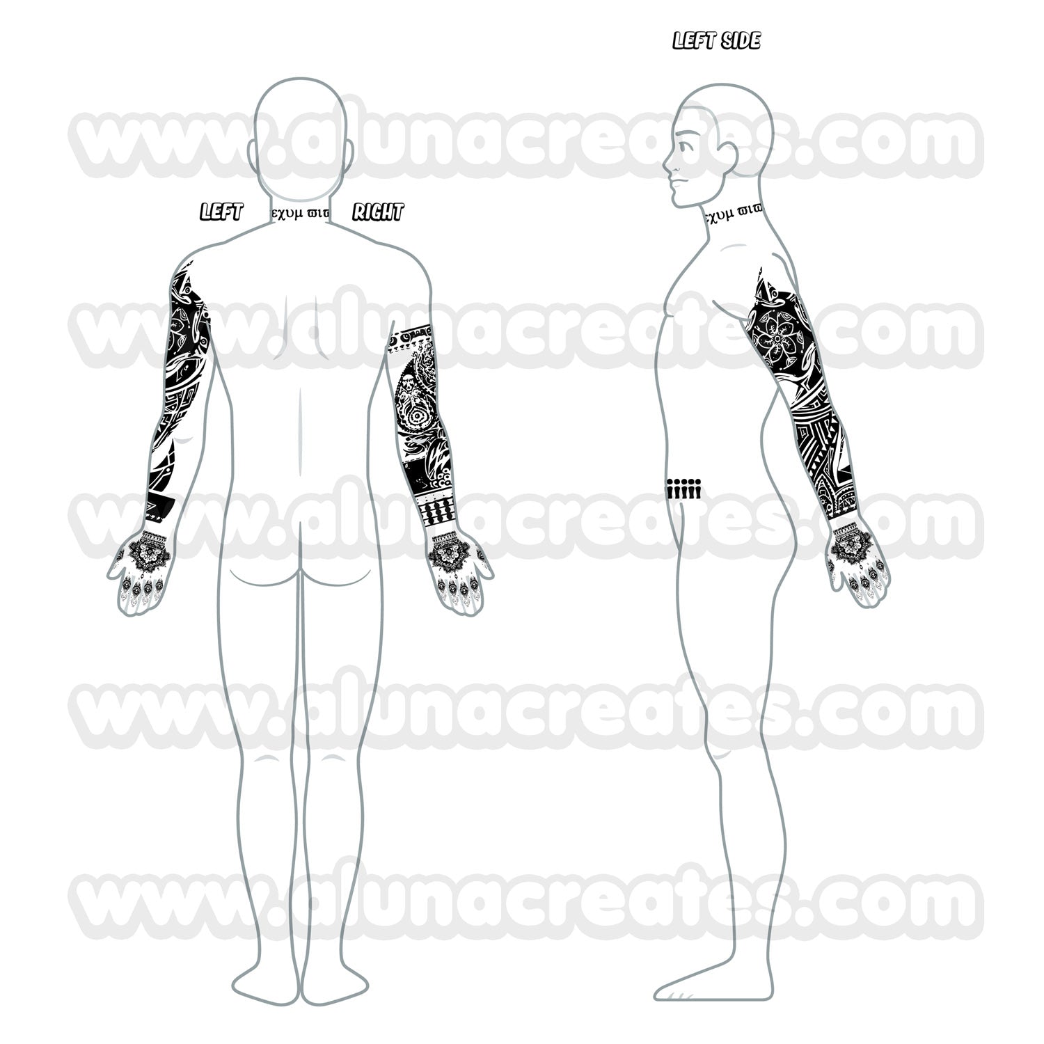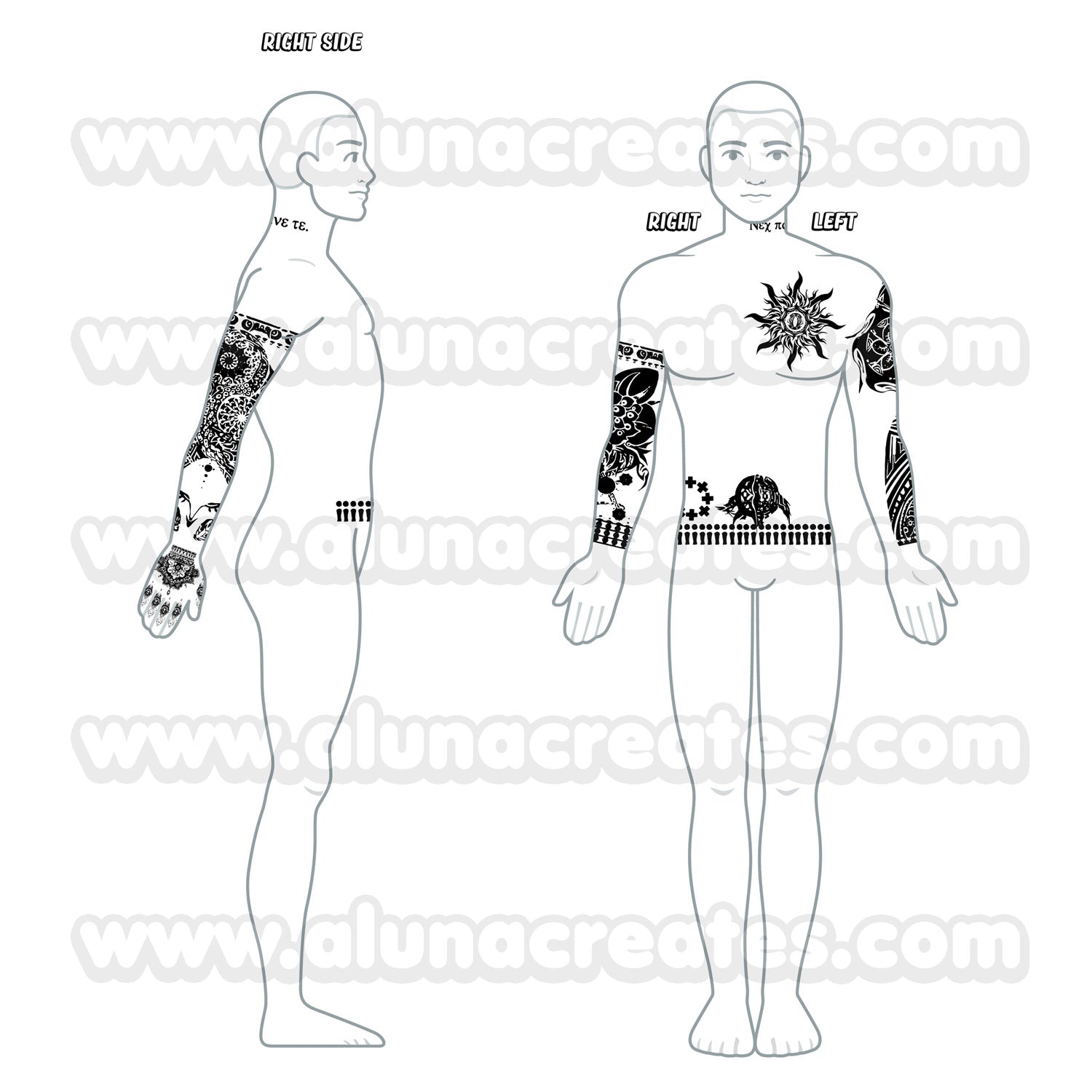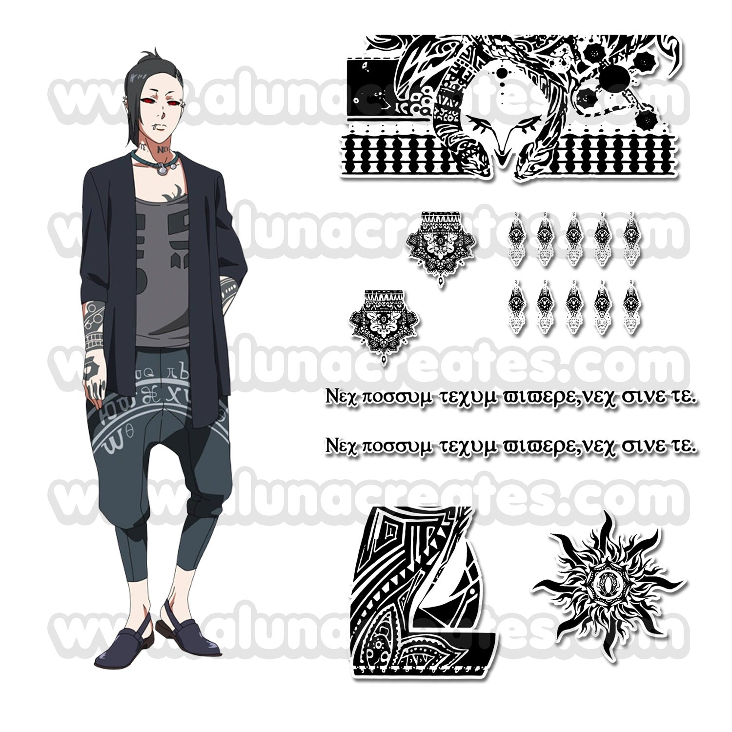 Wszystkie tatuaże są ilustrowane przez AlunaCreates. Nie rości sobie żadnych praw do oryginalnej postaci ani powiązanych treści.