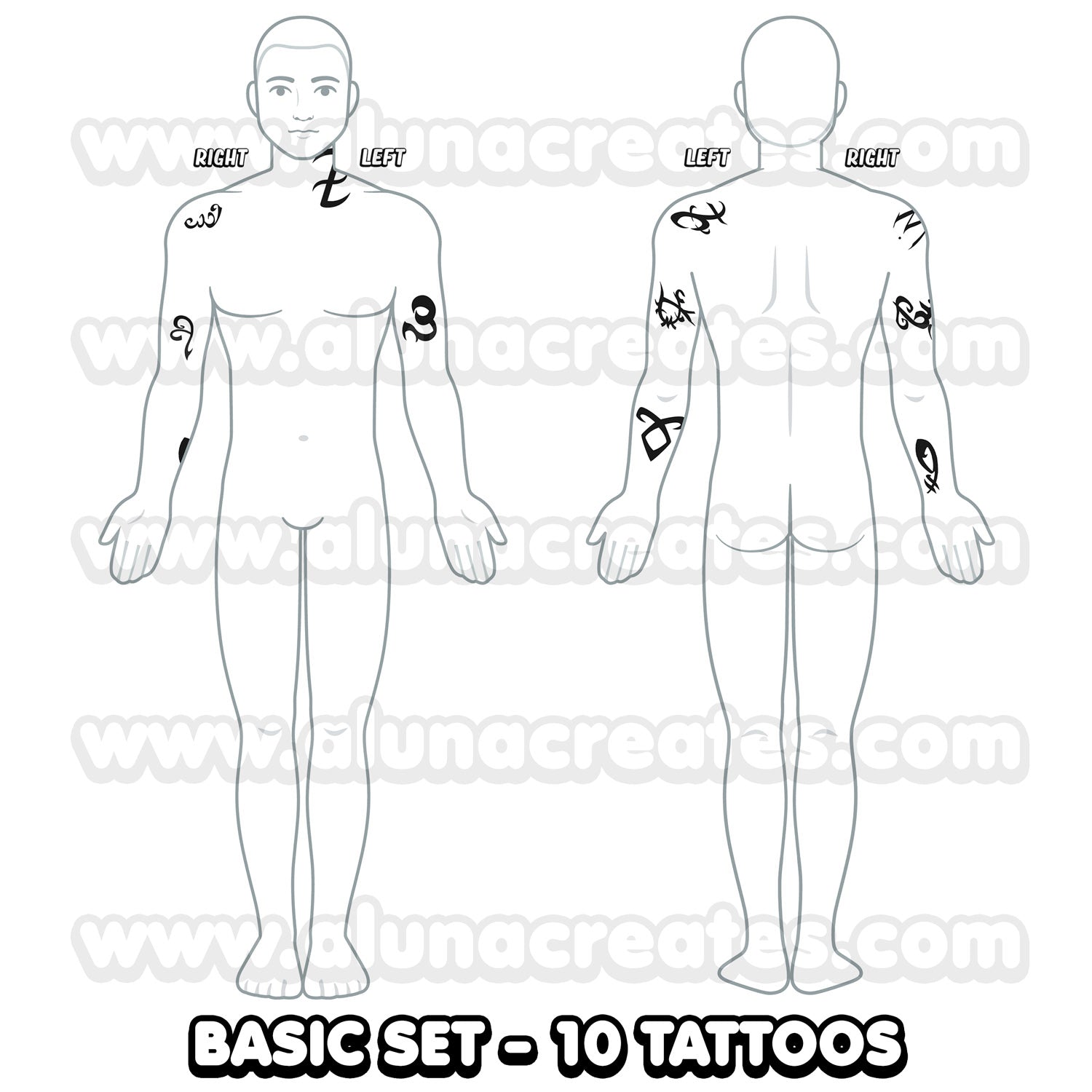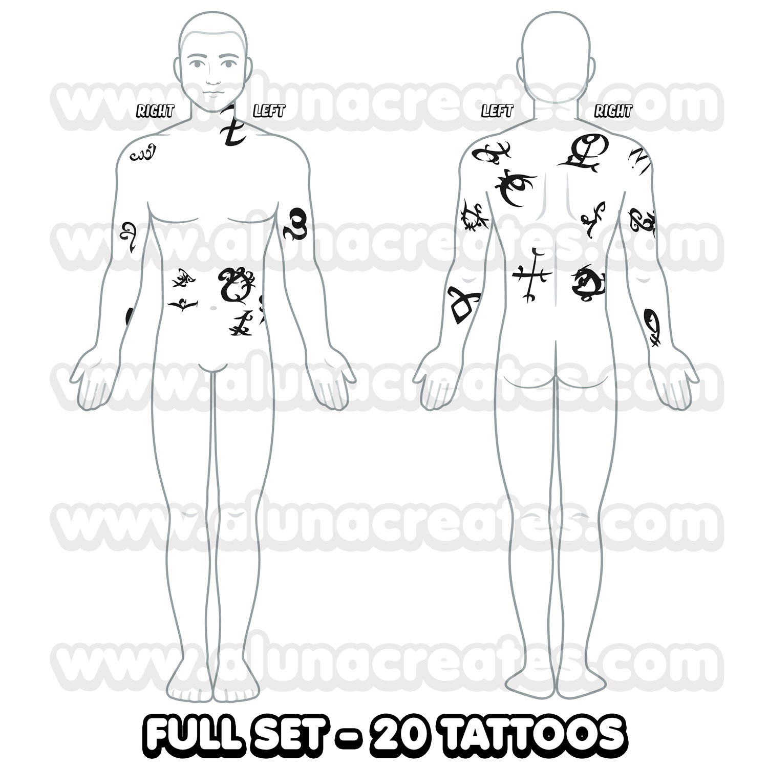 Set consists of 2(BASIC)/3(FULL)x A4 PDF/ 2(BASIC)/3(FULL)x LETTER PDF files including tattoos for neck, shoulders, arms, wrists, chest, stomach and back. Please check the gallery for exact measurements of each tattoo. Map of each rune and instructions for printing are included with your files.