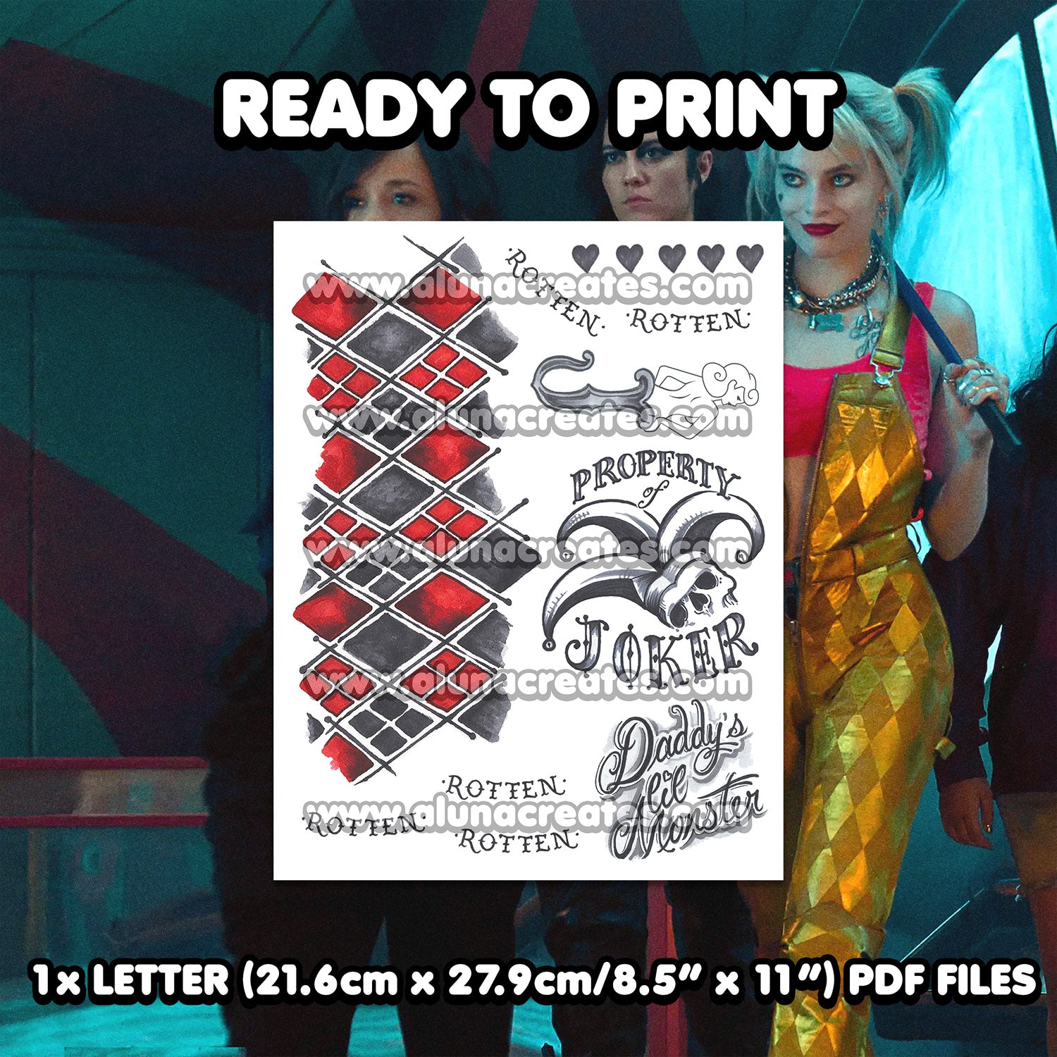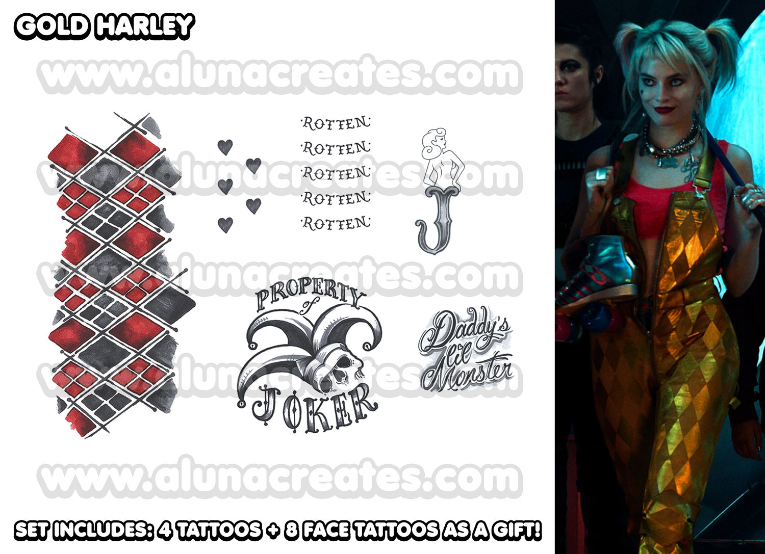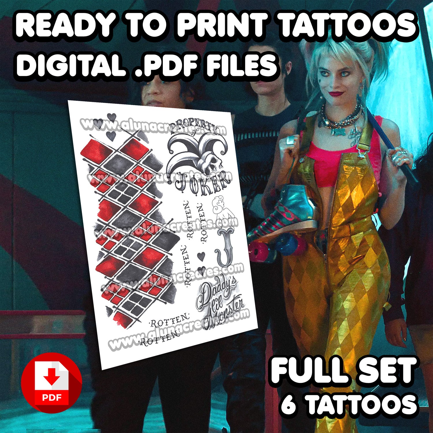 Harley Quinn (Gold) - Birds of Prey | READY TO PRINT .PDF TATTOOS | FULL SET - AlunaCreates