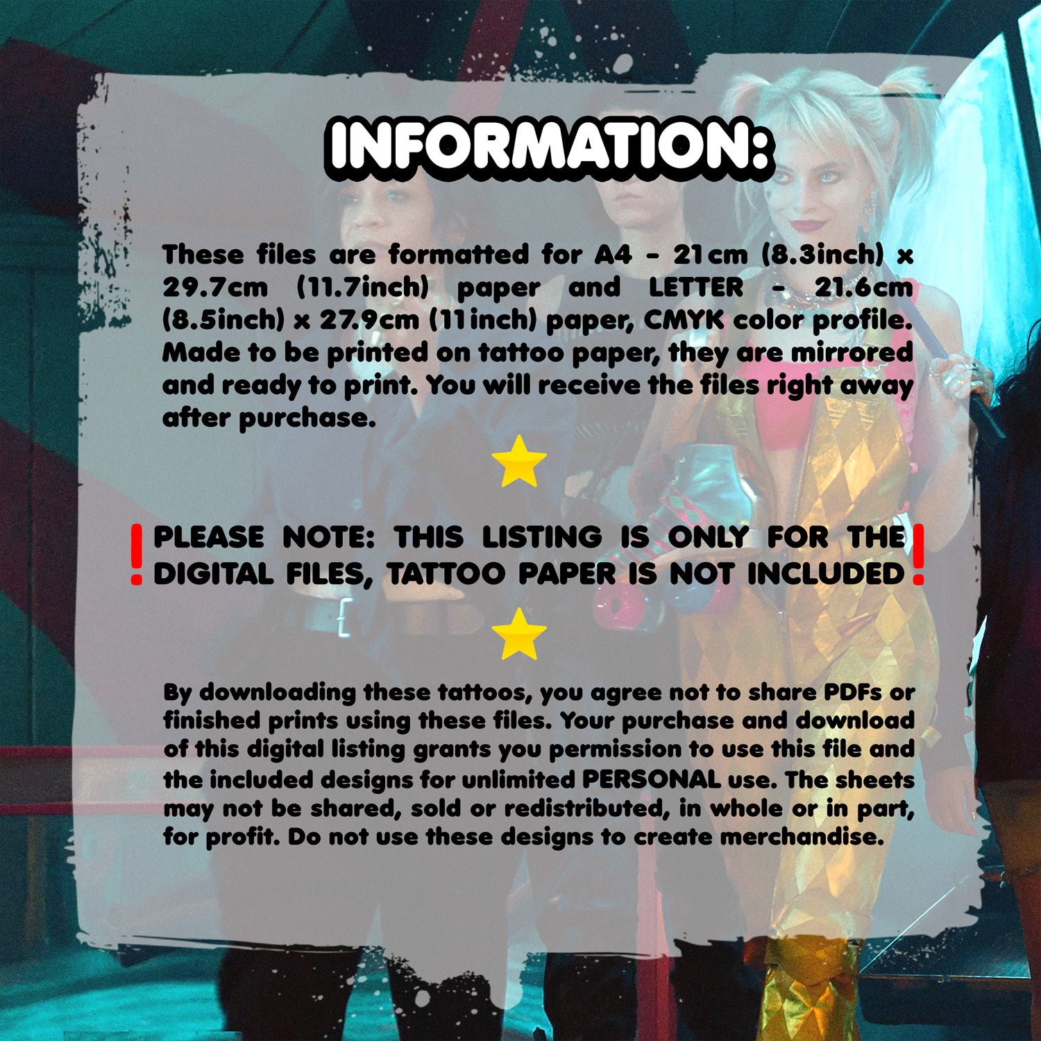 Set consists of 1x A4 PDF/ 1x LETTER PDF files including tattoos for face, arms, chest and back. Tattoos have one size of scaling (scaled for 165cm/5'4 height), but will fit almost every height and body type. Special effect applied to make them look as close to the movie as possible, they are slightly blue which is screen accurate with Harley. Please check the gallery for exact measurements of each tattoo. Map of all tattoos and instructions for printing are included with your files.